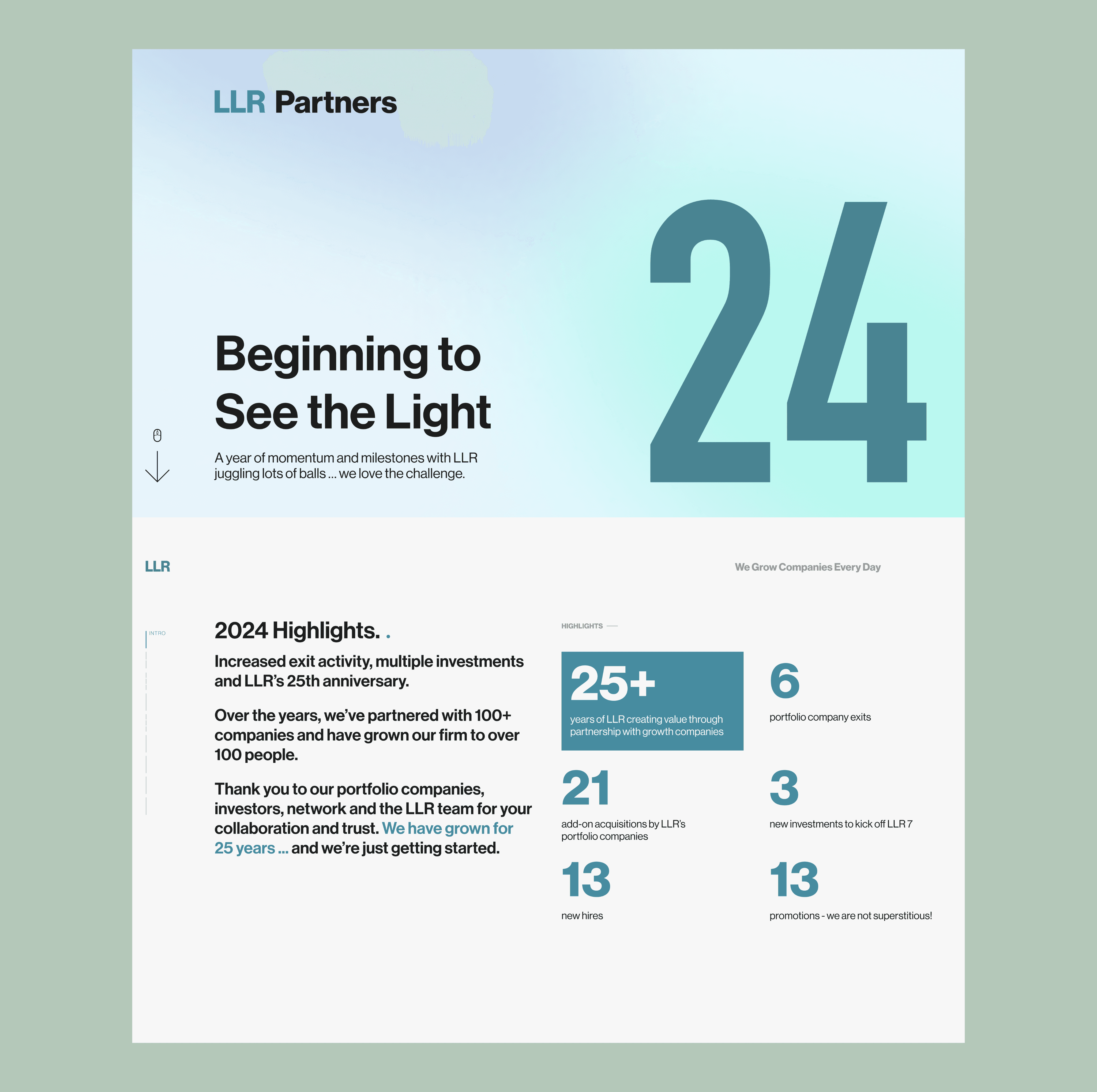 Working on this account I had to keep the brand standards in mind, but also try to improve and push the work forward in it's evolution to make sure LLR stood out from it's competition. One way we accomplished this was to push the brand forward in the annual year in review. While the content structure of the reviews was relatively the same year to year, we would attempt to utilize new designs, layouts, and graphics to keep it fresh and modern while staying true to LLR. We accomplished this by subtly including new accent colors or pushing the amount of well shot photography we used, something other private equity firms don't utilize as often.